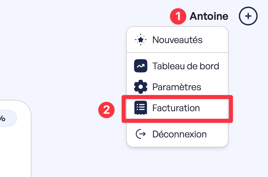 - Clique sur ton prénom pour afficher le menu, puis sur “Facturation”.