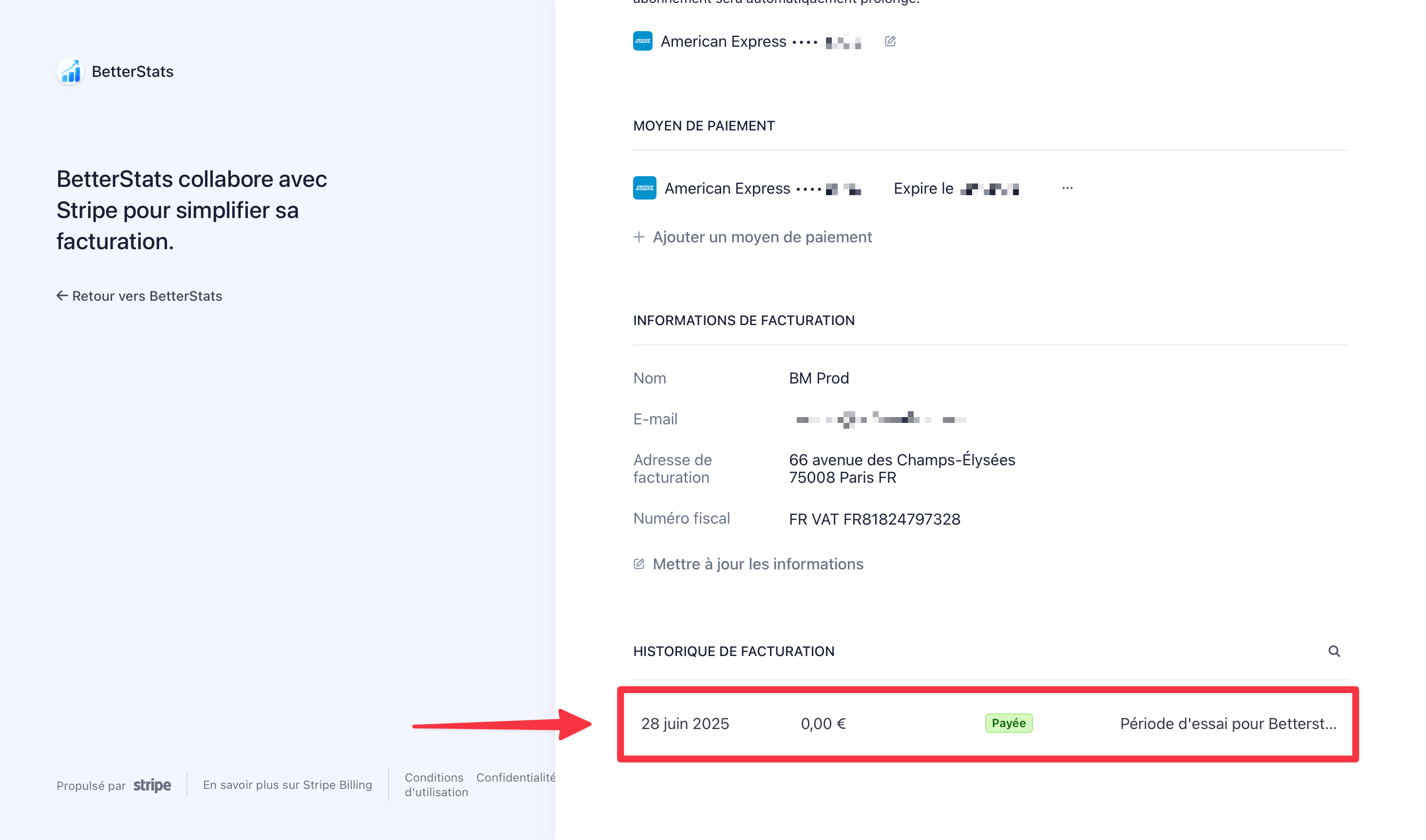 Voici comment télécharger une facture de ton abonnement BetterStats, avec le nom et l’adresse de ton entreprise.