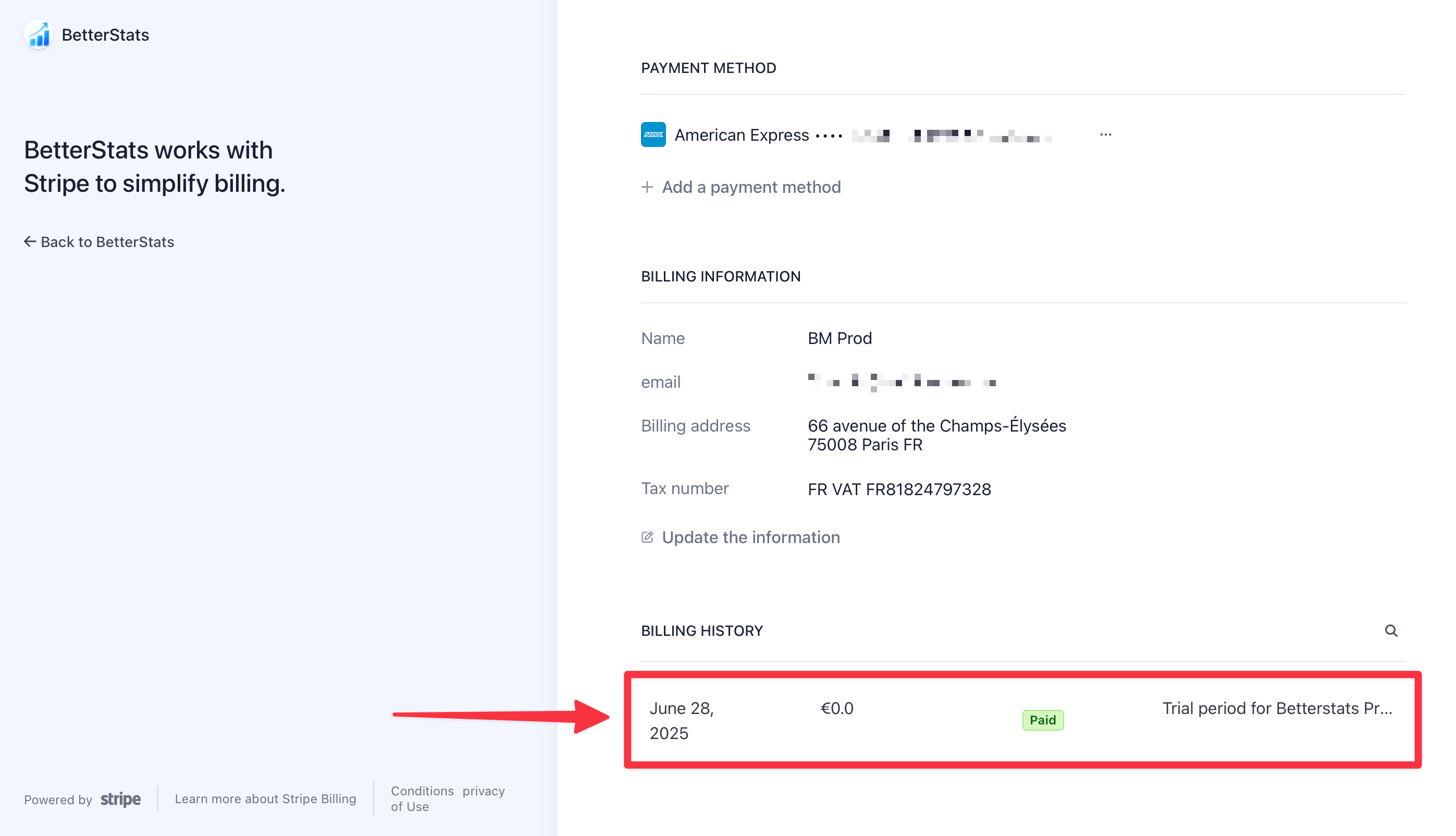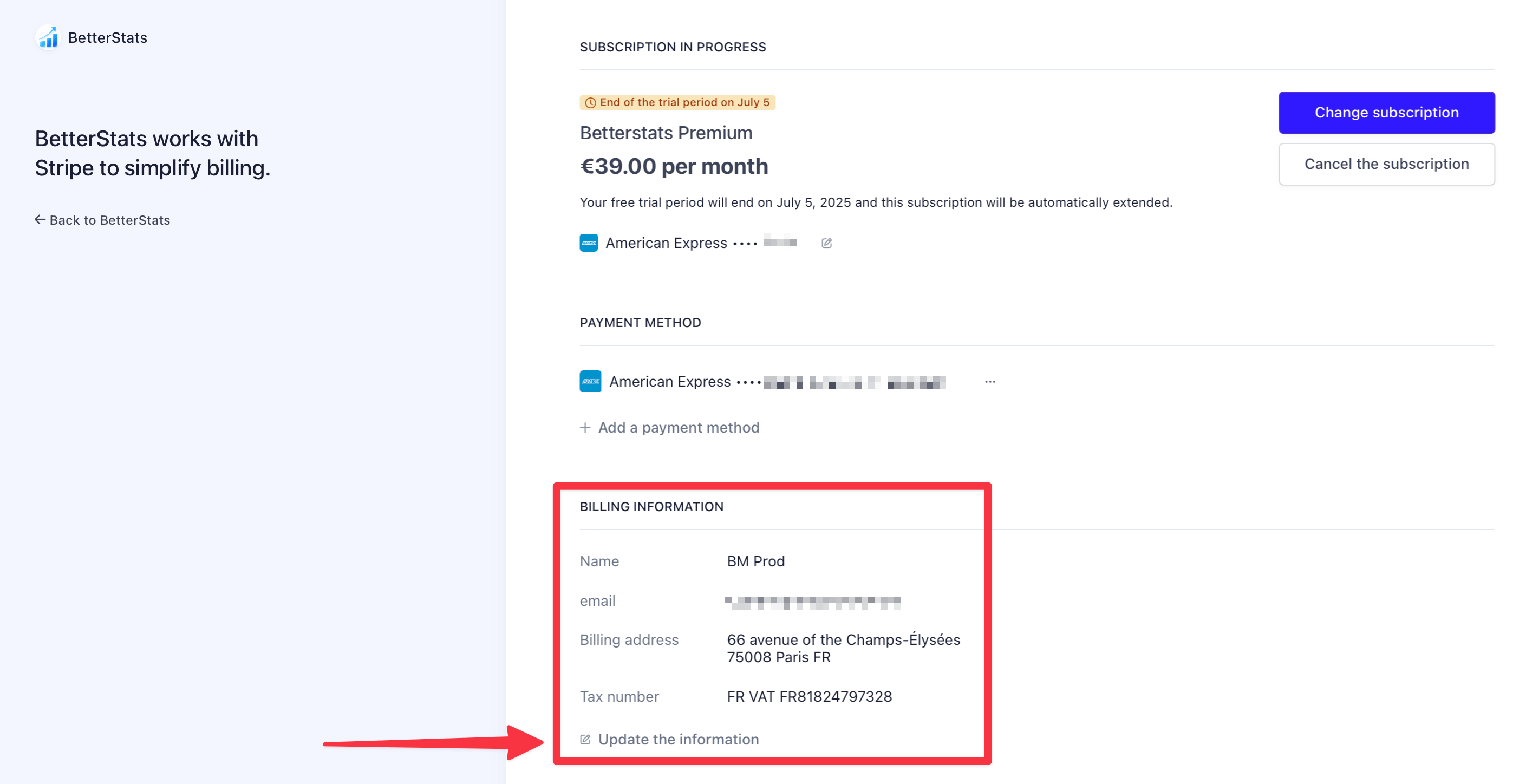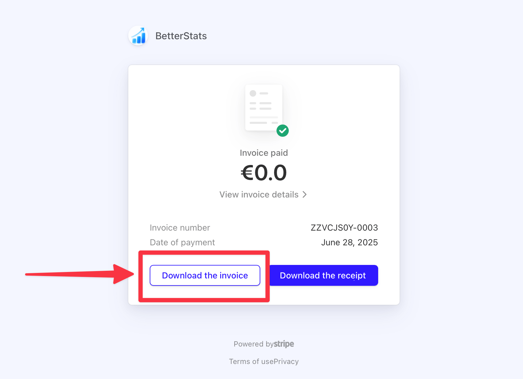 Here’s how to get an invoice for your BetterStats subscription with your company’s name and address: