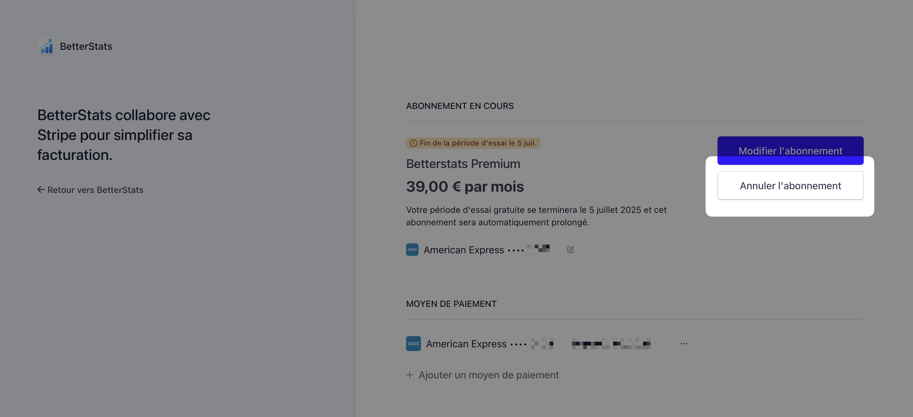Tes fonctionnalités de BetterStats resteront actives jusqu'à la fin de la période en cours, même si tu es en essai gratuit. Ta carte ne sera plus prélevée.