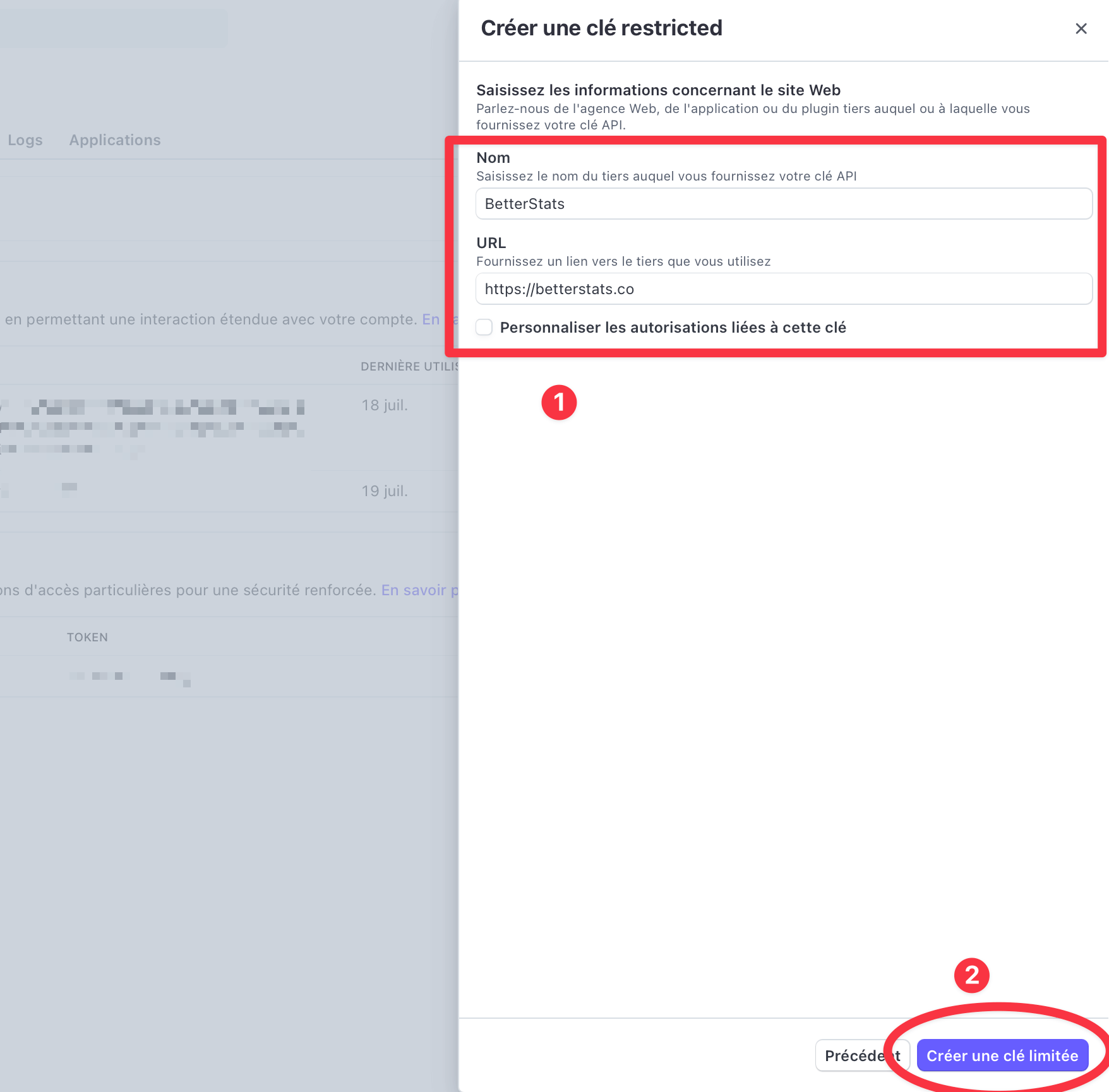 - Clique sur l'onglet "Clés API", puis "Créer une clé limitée"