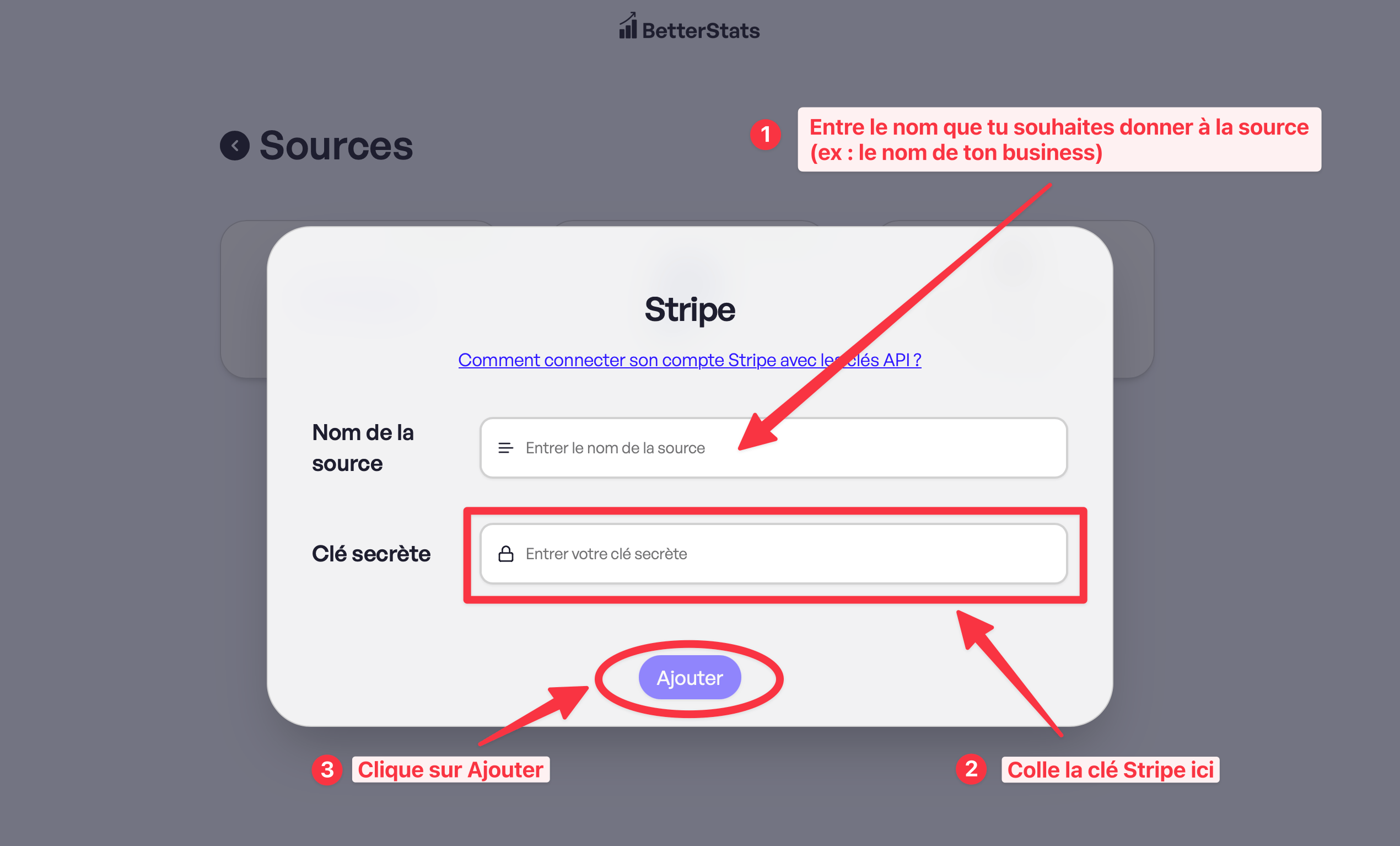 - Retourne sur BetterStats, entre le nom que tu souhaites donner à la source (par exemple, le nom de ton business), colle la clé Stripe, puis clique sur "Ajouter"