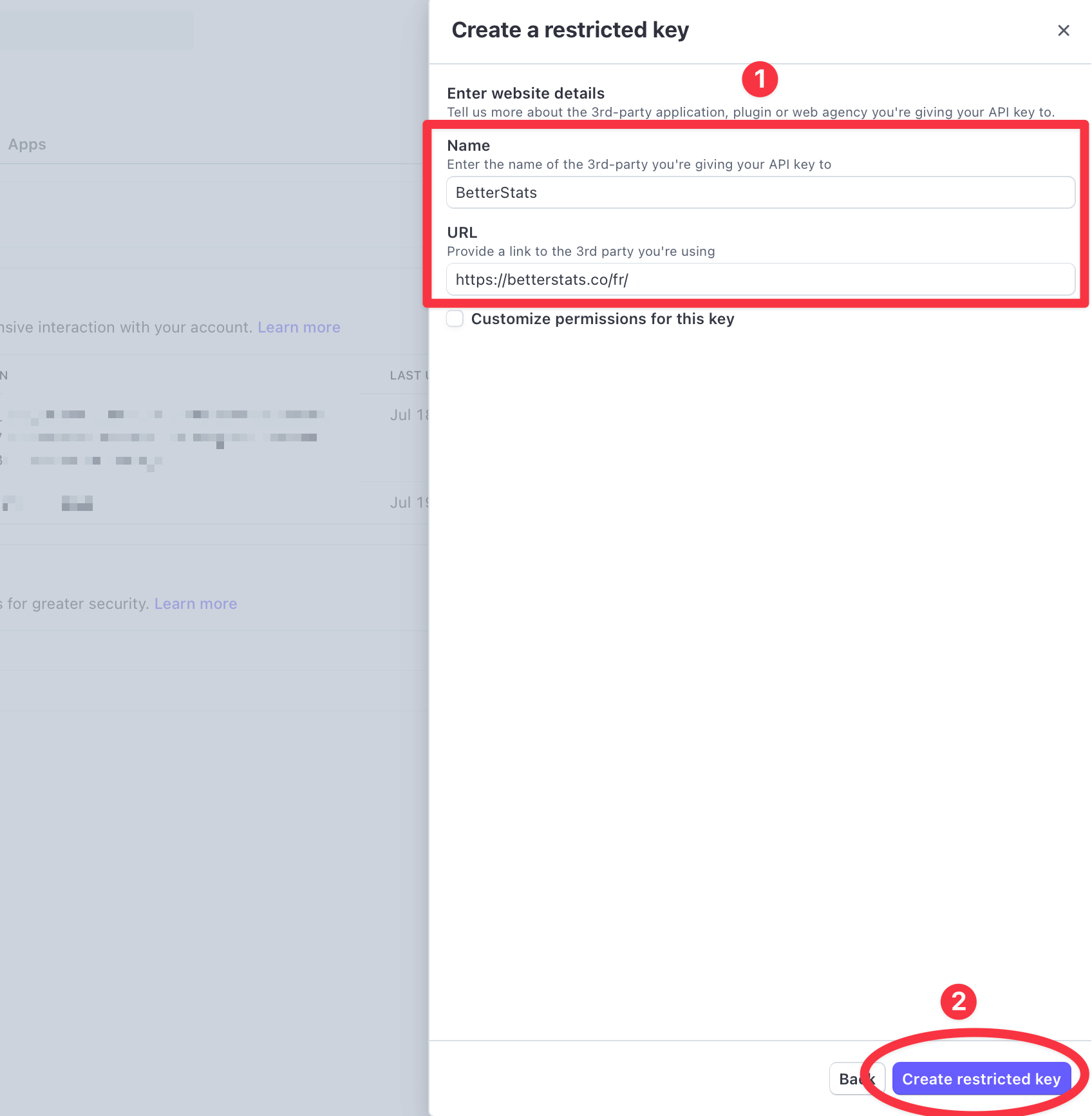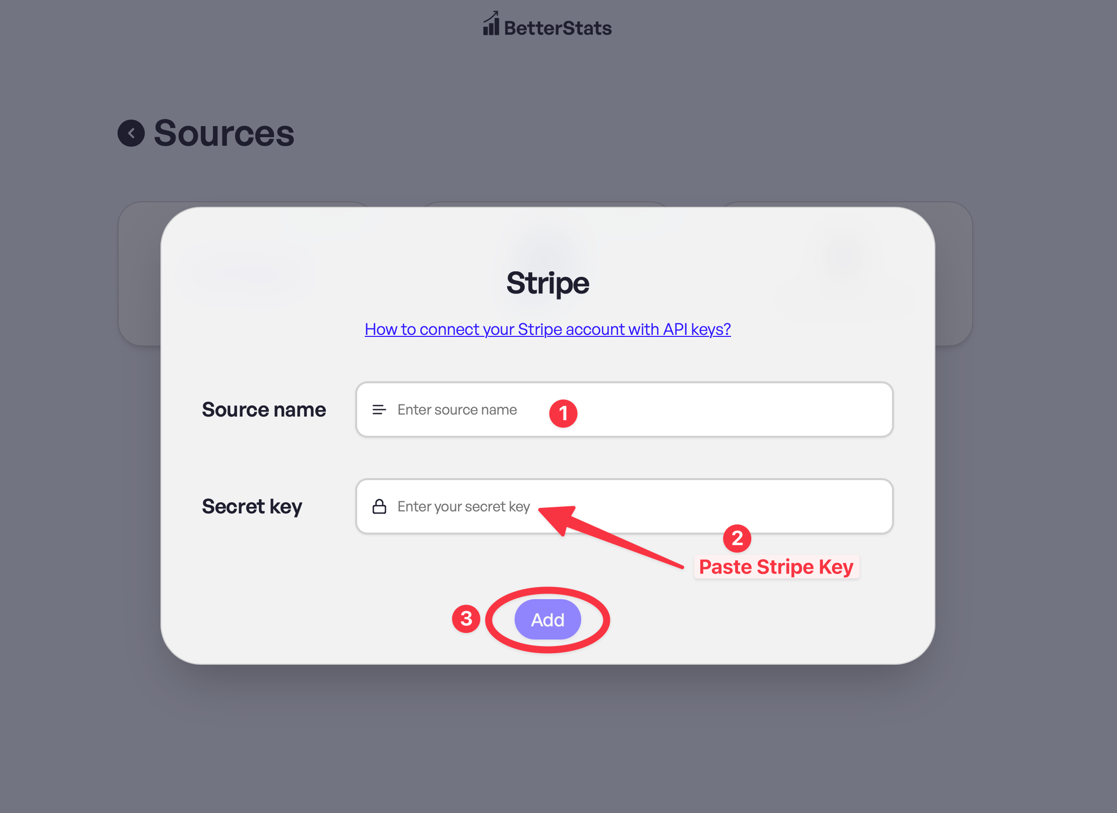 - Go back to BetterStats, enter the name you want to give the source (for example, your business name), paste the key, then click “Add”