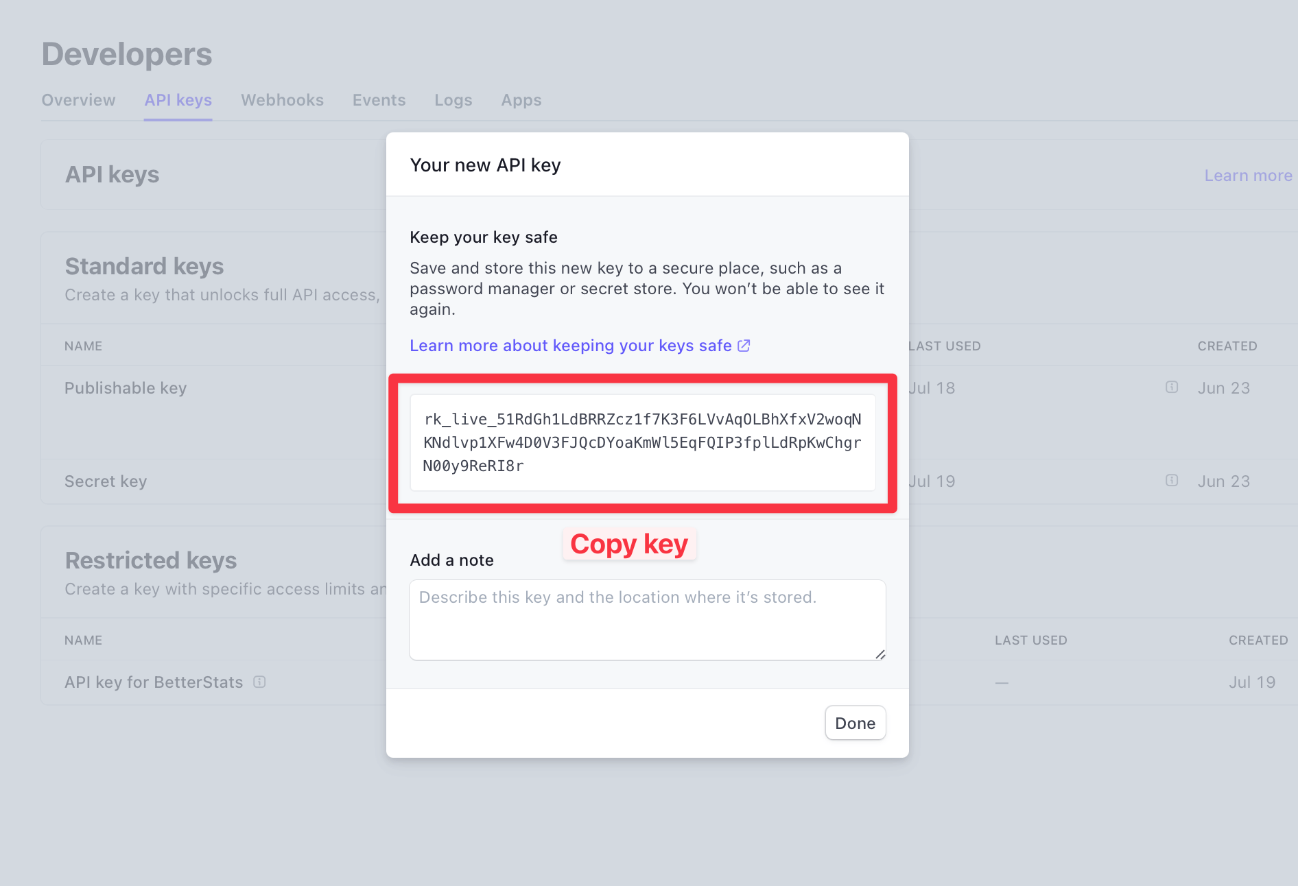 This tutorial is for users who cannot use the one-click Stripe connection. Some tools, like ThriveCart, already use this integration, which prevents BetterStats from using it.